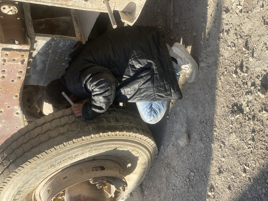 In Dahiyat Harasta, Syria, a single individual is observed in a crouched position outdoors, inspecting the underside of a large, stationary vehicle