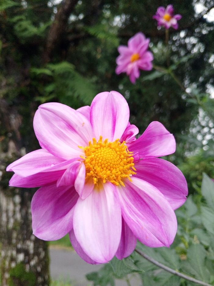A vibrant pink dahlia dominates the foreground, its petals streaked with white and surrounding a bright yellow center. Two more dahlias, slightly out of focus, appear in the background against a backdrop of green foliage and trees. The dahlia in the foreground is in full bloom, and its petals are slightly curved. The setting is natural and appears to be a garden or woodland.