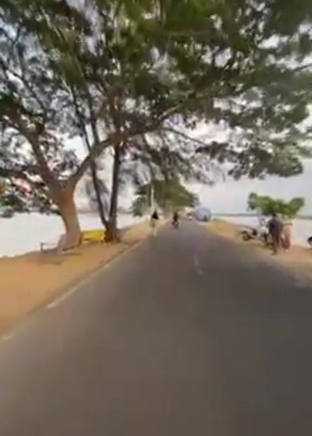 road beside a large body of water. A man in a jersey with the number 18 is walking along the road. A woman in a head covering and several people on scooters drive away from the camera. There is a large tree to the left of the frame and power lines above the road. There are people standing near the water, some of whom are looking at the water. There is a small building with graffiti on the right side of the frame. The water appears calm. The sky is light and cloudy.