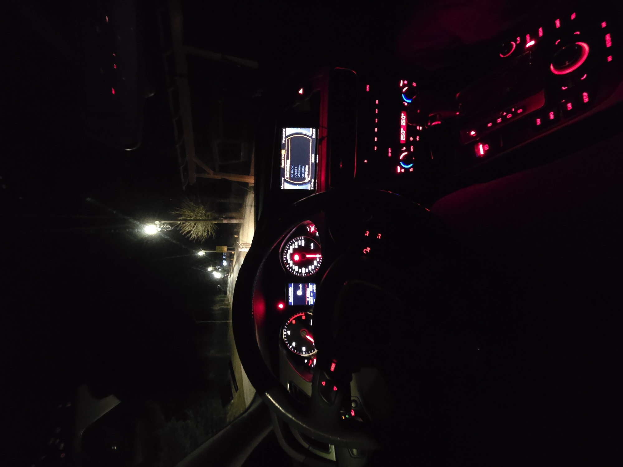 The image provides a driver's perspective inside a vehicle at night, situated on a street in Dospat, Bulgaria. The car's interior is predominantly illuminated with red light, particularly on the dashboard and center console controls. The instrument cluster features a tachometer on the left and a speedometer on the right, both indicating a reading of zero, with red needles and white markings. A central display within the instrument cluster also shows "0 km/h." The multi-function steering wheel is black with illuminated red buttons, including one labeled "MODE." On the center console, an infotainment screen displays a "Radio FM" interface, listing several Bulgarian radio stations such as "Radio Plus," "RADIO 1," "VESELINA," and "VITOSHA." Below this screen, climate control settings are visible, indicating "25.0°" for both driver and passenger sides, with illuminated blue and red rotary dials and buttons, including "AUTO" and "AC." Further down, the automatic gear shifter and surrounding control buttons (e.g., "NAV," "RADIO," "MEDIA," "CAR," "SETUP," "TEL") are illuminated in red. A button labeled "ESP OFF" is also visible. A driver's leg, clad in dark clothing, is partially visible on the lower right side of the frame. Through the windshield, a dark street in Dospat is visible, sparsely illuminated by several yellow-white streetlights lining the right side of the road. Bare-branched trees and some evergreen foliage are present along the roadside. A wooden architectural structure is faintly discernible on the far right, beyond the trees and streetlights. The overall environment is dark, with artificial light sources defining the immediate road and interior.