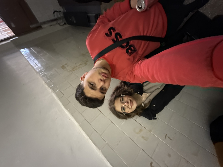 The scene is located in Pernik, Bulgaria. A low-angle selfie photograph captures two young adults indoors, standing against a tiled wall. The male subject, positioned in the foreground on the right, has short dark hair and a neutral expression with slightly pursed lips, gazing directly at the camera. He wears a red long-sleeved shirt with "BOSS" printed in black capital letters across the chest. A black strap, likely from a bag, crosses his left shoulder. His left hand holds a silver beverage can featuring a pink design, partially obscured. His right arm is extended, holding the camera. The female subject, positioned behind him to the left, has curly brown hair and round-framed glasses. She displays a slight smile and looks directly at the camera. She is dressed in a black jacket over a light-colored top. The background features light-colored, possibly white or light grey, square tiles with visible horizontal grout lines. The tiles show signs of wear and discoloration, particularly on the right side. In the upper right background, a dark vertical utility object is visible adjacent to a darker wall section and what appears to be an open doorway. The floor is obscured, with only a dark surface visible at the bottom of the frame.