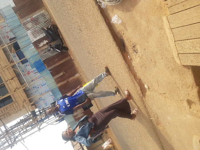 Two individuals stand on a sandy street adjacent to a building under construction. One is a woman wearing a denim jacket and a long brown skirt. The other is a man in a blue soccer jersey and light-colored pants. The construction site shows scaffolding, corrugated metal sheets, and wooden supports. The street is dirt with a few pieces of debris. The overall image is taken from a slightly high angle.