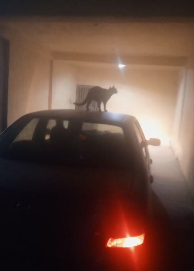 A cat is standing on the rear of a parked dark-colored car in a garage. The car has its rear lights illuminated. The garage has a single light fixture.