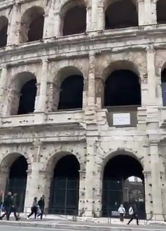 view of the Colosseum in Rome, Italy. The camera pans from the Colosseum, which is partially obscured by a street lamp, to a street with people walking on the sidewalk. The Colosseum is made of light-colored stone and has multiple tiers of arches. There are trees planted in concrete planters along the sidewalk, and the sky is overcast.