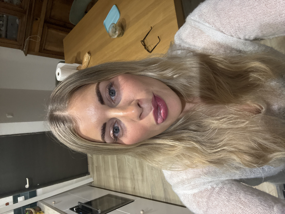 A woman with blonde wavy hair, blue eyes, and plump lips is depicted indoors