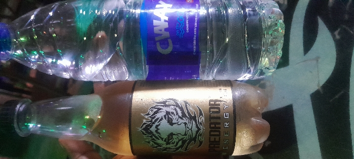 Two plastic bottles lie horizontally. The top bottle, filled with clear liquid, has a blue and white label reading "CWAY WATER." The bottom bottle contains a golden liquid and has a gold label featuring a tiger's face and the words "PREDATOR ENERGY." Condensation is visible on both bottles. The background is dark and blurry, with hints of green and black.
