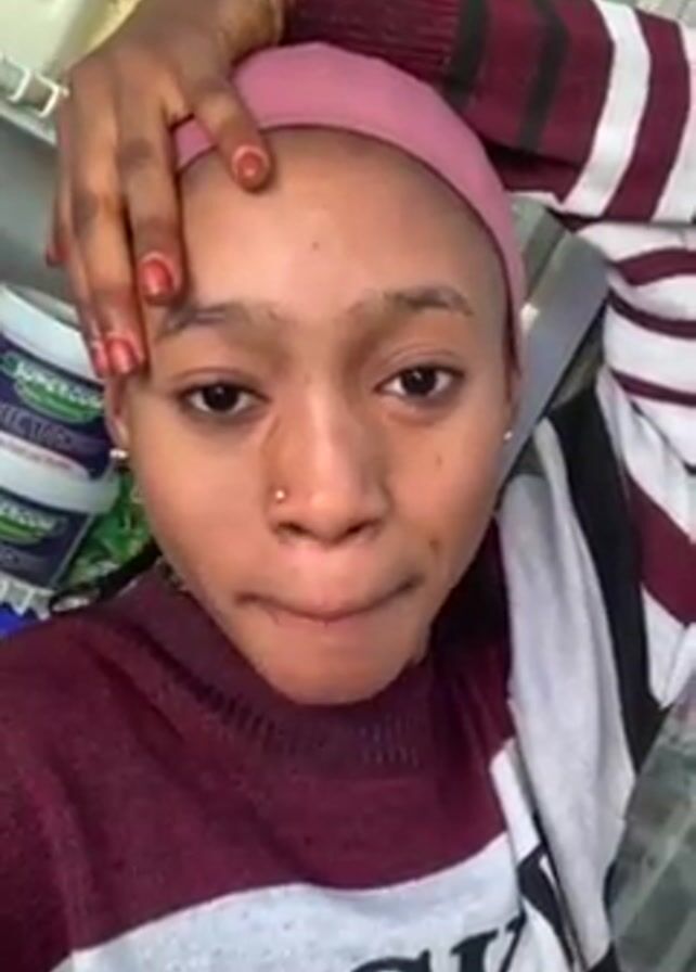 A young woman with brown skin, wearing a mauve head covering and a maroon, gray, and white striped sweater with text visible on the gray part, is centered in the frame. She has a nose piercing, dark eyes, and is making a pouting expression. Her hand, with reddish-brown nail polish, is touching her forehead. She is seemingly indoors in front of a refrigerator, as various food items including containers of Greek yogurt are visible in the background. The shot is close-up and slightly angled.