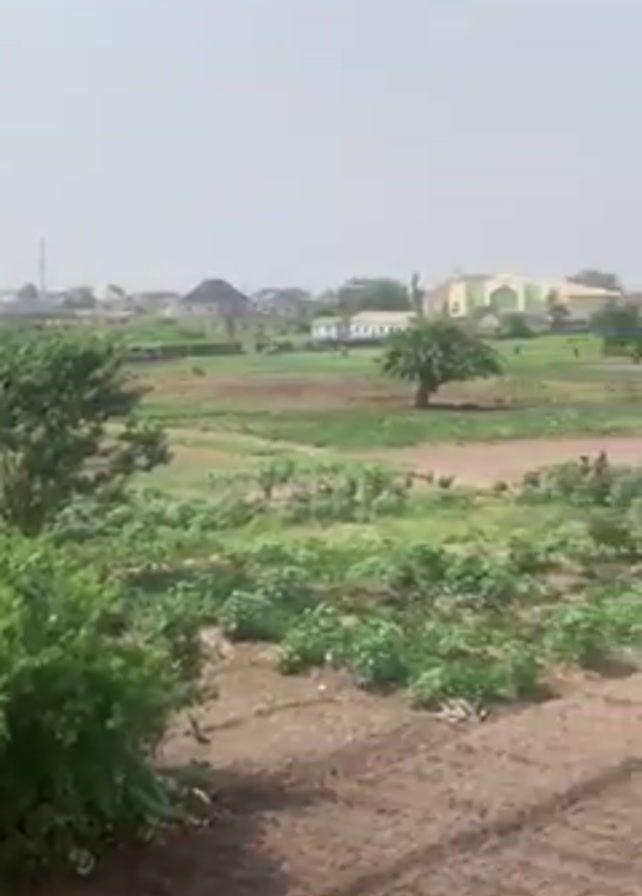 landscape with agricultural fields in the foreground and buildings in the background. The fields are divided into rows, with some areas showing bare soil and others with green vegetation. Several people are working in the fields. Beyond the fields, there are several buildings. The sky is overcast. The camera appears to be positioned at an elevated viewpoint, possibly inside a building, looking out over the scene.