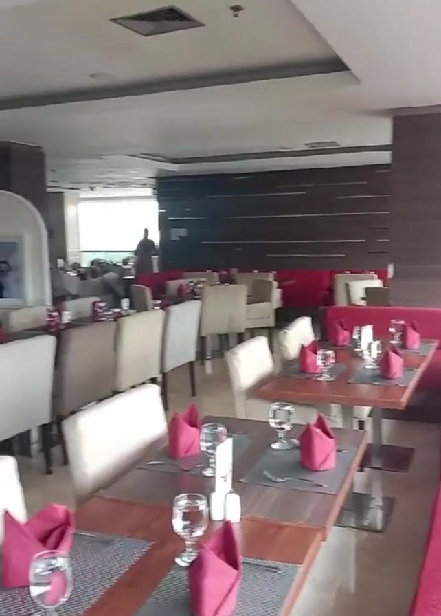 interior of a restaurant, likely in a hotel, set up for an event. Many tables are neatly arranged with place settings including glasses, silverware, and folded burgundy napkins. Most tables have light-colored upholstered chairs. There's also a long, burgundy booth lining part of a wall. Some people can be seen milling about, including a couple taking a picture near a flower arrangement. The restaurant is brightly lit. The decor includes wood paneling and some mirrors.