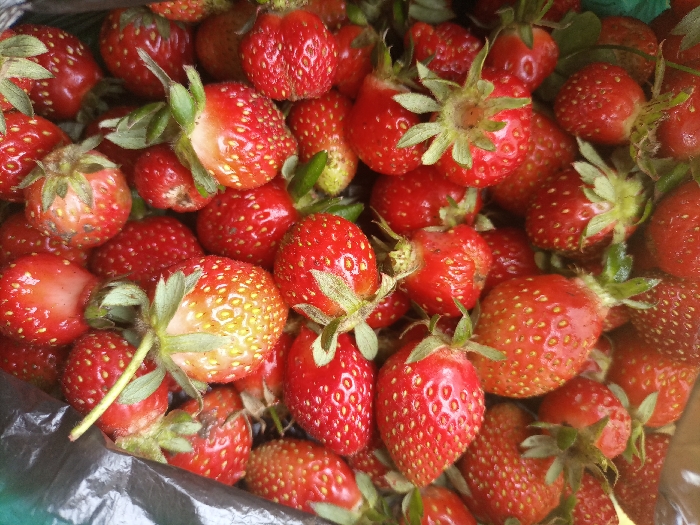 The image displays a close-up, overhead view of a dense collection of numerous strawberries. The fruit varies in ripeness, predominantly red with hues ranging from deep crimson to lighter orange-red, and includes visible pale yellow or white patches on some surfaces. Each strawberry exhibits a textured surface with discernible achenes. Most retain their green calyxes and short stems. Minor surface imperfections, including slight bruising and adhering debris, are visible on various fruits. A dark, black, pliable material, consistent with a plastic bag, is visible along the bottom and lower left edge, partially containing the strawberries. No individuals, specific actions, or interactions are depicted. The scene's location is unidentifiable within the city of Unknown, Unknown.