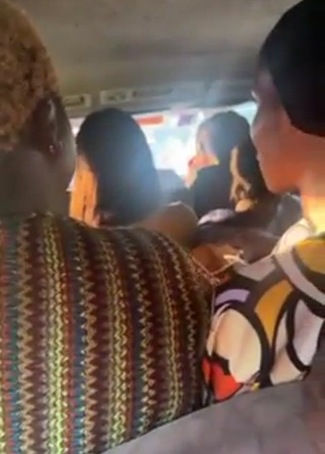 Inside a vehicle, several people are visible. One person is holding a phone, filming from the back seat. The focus is on the passengers in front, some of whom are looking at a screen in the front of the vehicle. The interior of the vehicle is lightly colored.