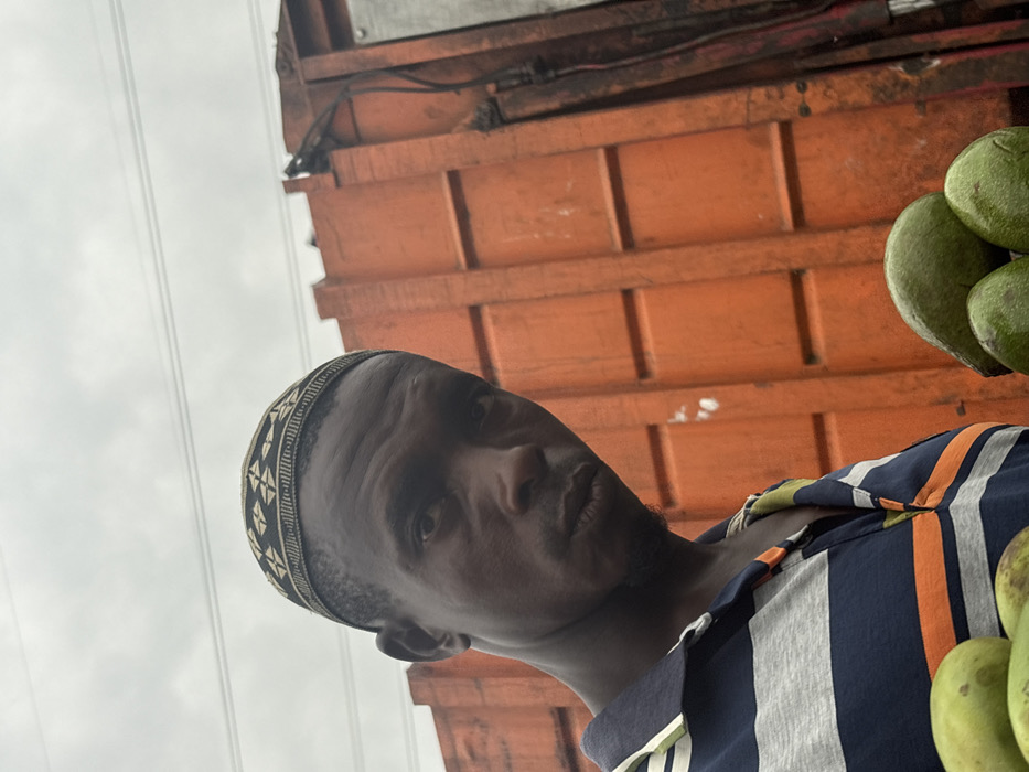 A man in a patterned hat and vertically striped shirt stands facing the camera. Behind him, an orange, tiered structure with metal cables. Green fruit hangs to the right. Overcast sky is visible in the upper left corner. The image is rotated, making the subject appear sideways. The man has dark skin and a slight beard.