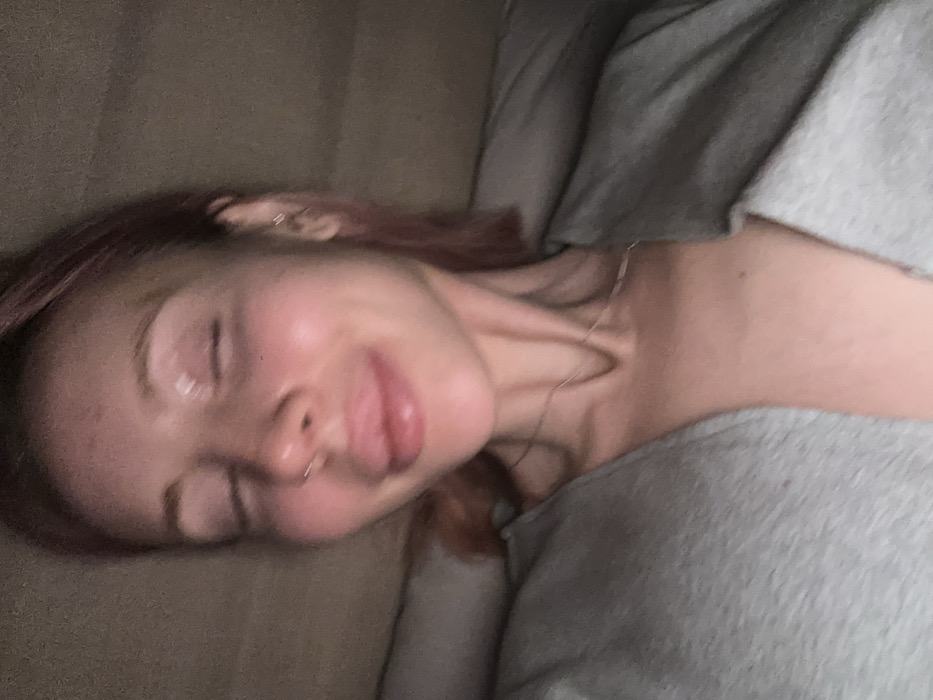 A person is lying down, eyes closed, with pink-tinged hair visible. They have a nose piercing and are wearing a delicate necklace. The person is resting on a beige-colored surface. The individual appears to be wearing a gray top, possibly a t-shirt or sweatshirt. The image is slightly blurry.