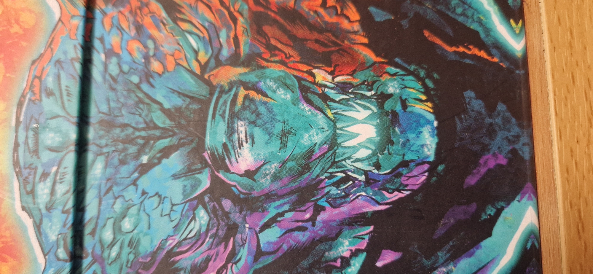 The image appears to be a close-up of an abstract artwork or print with a vivid color palette including blues, teals, purples, oranges, and blacks. The artwork features a central, roughly spherical form with textured surfaces, possibly depicting a stylized organic or alien entity. There are sharp, tooth-like or jagged elements visible, and the overall impression is somewhat surreal and possibly aggressive in tone. The artwork is framed by a light-colored wooden edge, suggesting it is a framed print or canvas. There's no discernible information to suggest this image is located in Ruse, Bulgaria. The location cannot be identified based on visual data.