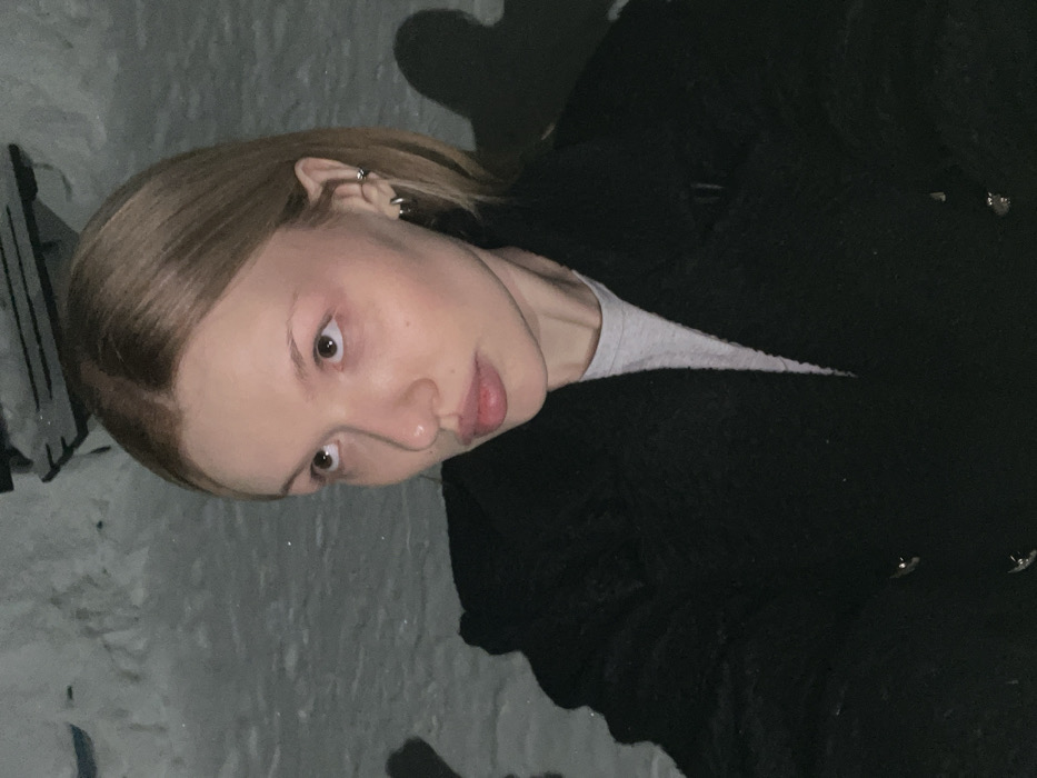 The image displays a close-up, waist-up portrait of a young adult female situated outdoors during nighttime or in very low light. The individual has light brown hair and fair skin, and is observed looking upwards and slightly to the right. She is attired in a black, textured overcoat worn over a light grey t-shirt or similar garment. Her visible left ear features multiple silver-colored hoop earrings: two on the earlobe and one on the helix. The background is indistinct, showing snow-covered ground and a partially visible dark object consistent with a park bench, also covered in snow, indicating a winter setting. No specific landmarks or identifiers are visible to pinpoint an exact location within Chaikovsky, Russia.