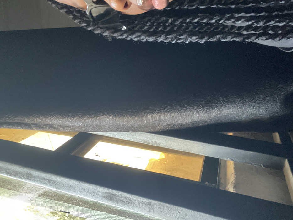 The scene depicts a partial interior view within the city of Ajaokuta, Nigeria, looking towards an illuminated exterior through a window. On the right side of the frame, the right profile of a person with dark skin is visible, featuring long, dark twist braids cascading downwards. The individual wears dark-rimmed sunglasses. A dark, textured fabric, likely a curtain, partially covers the person and the right side of the window. To the left, a window assembly features dark, possibly metallic, vertical and horizontal bars. A fine mesh screen is visible on the far left. Beyond the window structure, a bright, diffuse yellow light indicates an exterior environment. Below the window, a light-colored, possibly concrete, sill or ledge is present. No explicit actions or interactions are discernible beyond the person's partial presence near the window.