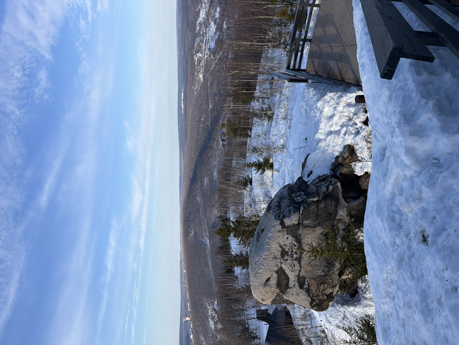 An elevated panoramic view over a snow-covered, forested landscape in Gubakha, Russia, is depicted under a clear blue sky with sparse cirrus clouds. The foreground features a substantial, irregularly shaped gray rock formation, partially covered by snow, with visible graffiti including the number "63." A small evergreen tree grows near its base. To the left of the rock, a dark wooden structure is partially visible. To the right, a wooden observation deck with dark railings extends, its light-colored plank surface contrasted by the surrounding snow. The immediate ground is heavily covered in white snow, indicating winter or early spring conditions. The midground and background reveal rolling hills and valleys densely covered with a mix of bare deciduous trees and scattered conifers, all partially blanketed in snow. Long shadows stretch across the distant hills from the bright sunlight. On the distant left horizon, an industrial complex with multiple structures and towers is visible, signifying a developed area of Gubakha. The scene is devoid of human presence or activity.
