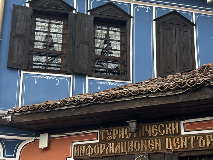 This image depicts the exterior facade of a building identified as the Tourist Information Center in Koprivshtitsa, Bulgaria, showcasing traditional Bulgarian Revival architectural elements