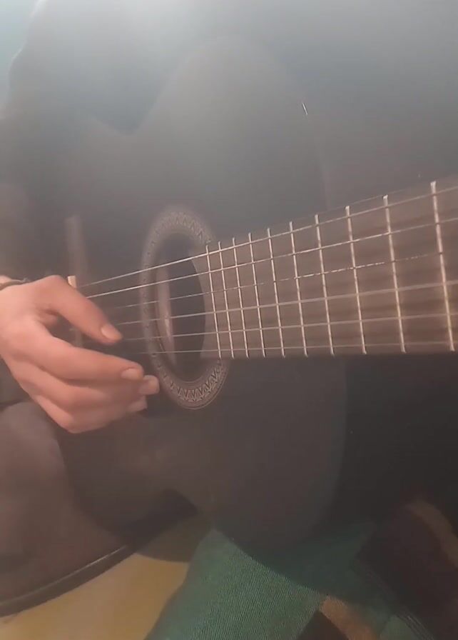 A person is playing a black acoustic guitar. The guitar is positioned vertically in the frame, with the neck and strings clearly visible. The person's left hand is seen fretting the strings near the sound hole of the guitar, while their body and right hand are obscured by the guitar. The background is blurry and indistinct. A green, patterned cushion or fabric is visible beneath the guitar. The lighting is bright, and there is a noticeable glare at the top of the frame.