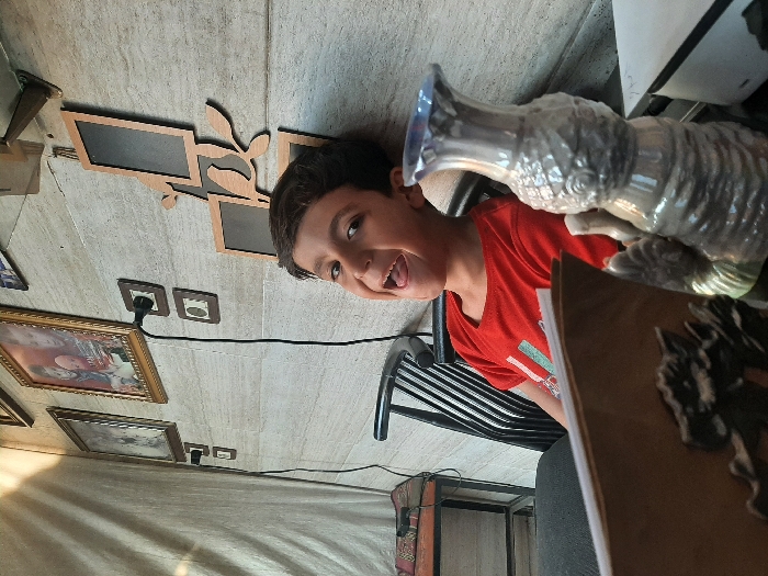 The image depicts an indoor residential setting in Al-Qadam Municipality, Syria. A young male child, with short dark hair and wearing a red short-sleeved t-shirt featuring a light-colored graphic, is seated in a black slatted chair, facing towards the viewer. He presents a wide, open-mouthed smile with his tongue visible. In the immediate foreground, partially obscuring the lower right portion of the child, is an iridescent, textured vase with a blue-tinted rim, exhibiting an organic, possibly stylized fish-like, shape. To the left of the vase, an open brown book or folder with a dark, embossed design is partially visible. The background consists of a textured light beige wall. Mounted on this wall are multiple framed pictures: a prominent central gold-framed picture of two children, flanked by smaller dark-framed pictures to its left. Several electrical outlets are also present on the wall; a black cord is plugged into one double outlet located below the gold-framed picture. To the right, a decorative wooden wall hanging features multiple empty rectangular frames interconnected by stylized bird and leaf cutouts. A light-colored curtain or drapery is visible on the far left, alongside a partially seen small dark table holding a patterned item.