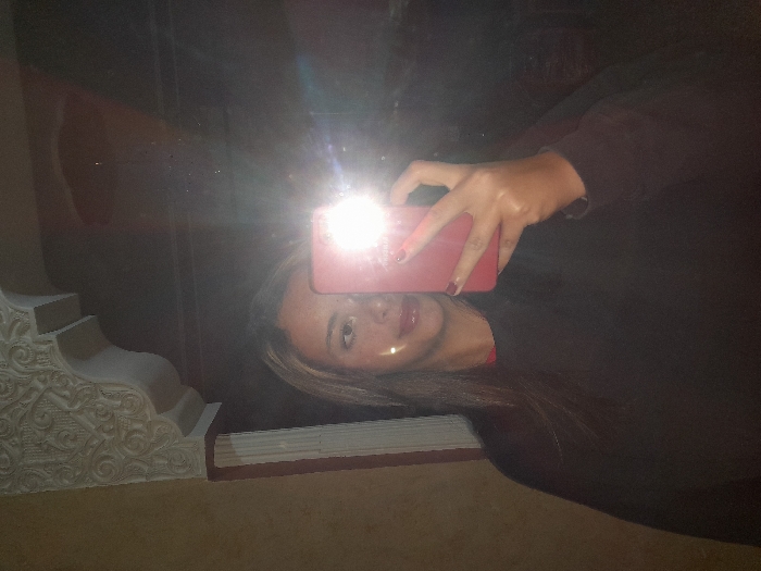 A woman poses in a mirror, holding a red phone