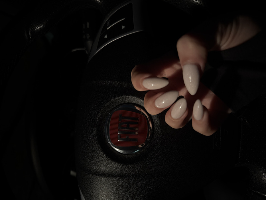 The image displays a close-up view of a human hand positioned over the steering wheel of a vehicle. The hand, exhibiting five visible fingers, features almond-shaped artificial nails coated in a light beige or nude polish, possibly with a fine glitter or shimmer. The steering wheel is black, textured, and centrally displays a red oval emblem with the silver text "FIAT," identifying the vehicle's manufacturer. Control buttons, including directional arrows and a "SRC" button, are visible on the right spoke of the steering wheel. The overall lighting is dim, indicating low light conditions within the vehicle's interior. The specific location within Salford, United Kingdom, cannot be determined from the visual evidence provided.