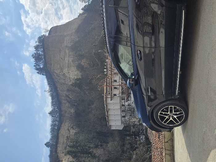 The image displays a black Mercedes-Benz SUV, consistent with an ML or GLE model, parked on a paved surface in the foreground, angled slightly to the right. The vehicle exhibits multi-spoke alloy wheels with a black and silver finish, tinted windows, and silver running boards along its lower side. In the mid-ground, a multi-story white building with a brown roof and numerous windows is visible, situated behind a low stone wall topped with terracotta roof tiles. Several satellite dishes are affixed to the roof of this building. The broader background is dominated by a prominent, light-colored geological formation resembling a large earth or sand cliff, characterized by distinct horizontal stratification. The upper edge of this cliff is densely covered with coniferous trees, while its lower slopes feature a mix of bare deciduous trees and scattered evergreen foliage. The sky overhead is blue with scattered white cumulus clouds. No individuals are present in the scene, and no specific actions or interactions are occurring. The location is an unnamed urban or semi-urban area, characterized by a mix of natural landscape and architecture, in the city of Unknown, Unknown.