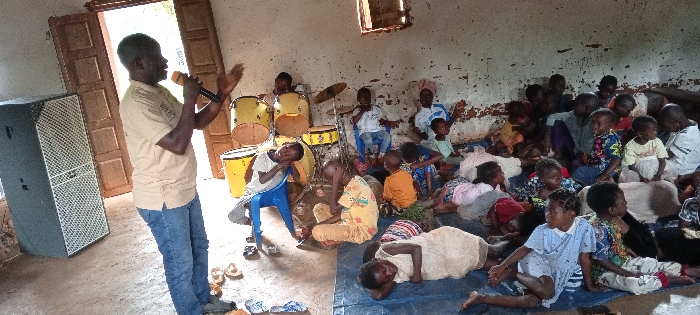 The image displays an indoor gathering in Konongo, Democratic Republic of the Congo. A dark-skinned adult male, dressed in a tan short-sleeved collared shirt and blue jeans, stands on the left, holding a black microphone in his left hand and gesturing with his right. He faces a crowd of approximately 30-40 individuals, primarily young children ranging in age from toddlers to early teens. The children are seated or lying on the floor, largely on blue tarps and various patterned cloths, occupying the center and right sections of the room. Their attire is diverse, including t-shirts and dresses. Some children are attentive to the speaker, while others appear to be resting or observing their surroundings. To the left of the speaker, a tall, dark-colored sound system speaker cabinet with a white grille stands on the concrete floor. Multiple pairs of sandals are placed on the floor near the speaker's feet. In the background, a yellow acoustic drum set, comprising bass drums, tom-toms, and cymbals, is visible behind some children. The room's walls are painted white, exhibiting substantial wear, including peeling paint and discoloration. A partially open double wooden door, constructed from light brown planks, is situated behind the speaker on the left, leading to an outdoor area. An unglazed rectangular window opening with a visible wooden frame is present in the upper right wall. The floor is an unadorned concrete surface. The scene is illuminated by natural light entering through the openings.