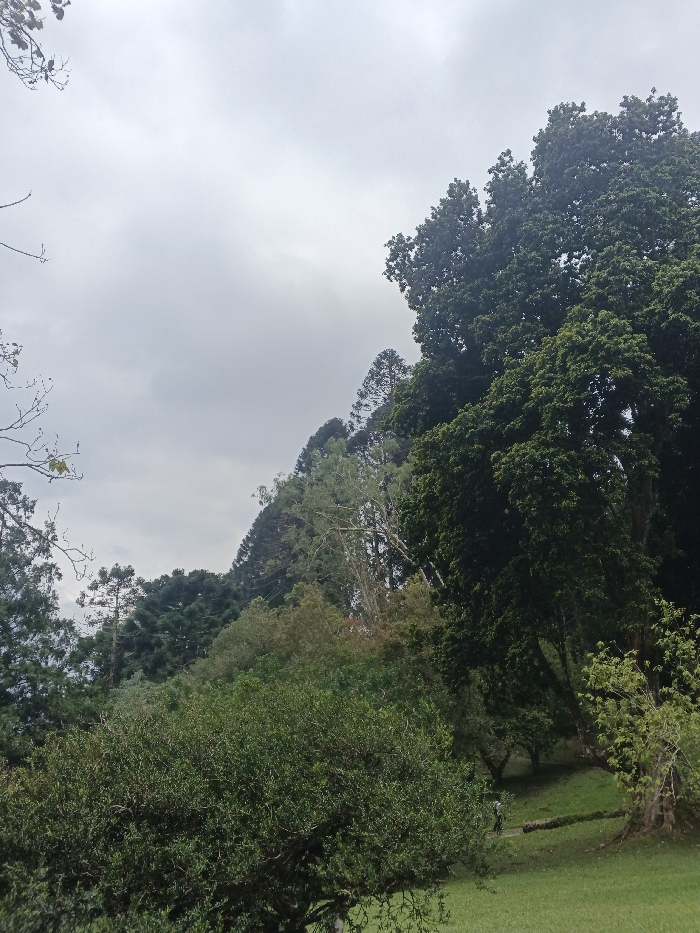 The image depicts an outdoor scene in Kwekwe, Zimbabwe, under an overcast sky characterized by light grey cloud cover. The foreground consists of dense, dark green shrubbery. The midground and background are dominated by a variety of trees, forming a thick canopy. Tall, slender coniferous trees are visible on the left, ascending a slope, while a mix of broadleaf and other coniferous trees with varying shades of green foliage occupies the right side of the frame. A grassy slope is present on the lower right, partially obscured by trees. One individual, dressed in a light-colored top and dark trousers, is visible walking uphill on this grassy slope, facing away from the viewer. A fallen tree branch or log lies horizontally on the grass near the bottom right. The environment suggests a park or a heavily wooded natural area.