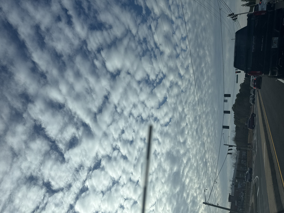 A sky filled with altocumulus clouds, creating a rippled effect above. Thin power lines run across the sky. A road with cars is visible on the right side of the frame. Traffic lights and trees are also present. The scene appears to be captured from inside a vehicle, looking upwards.
