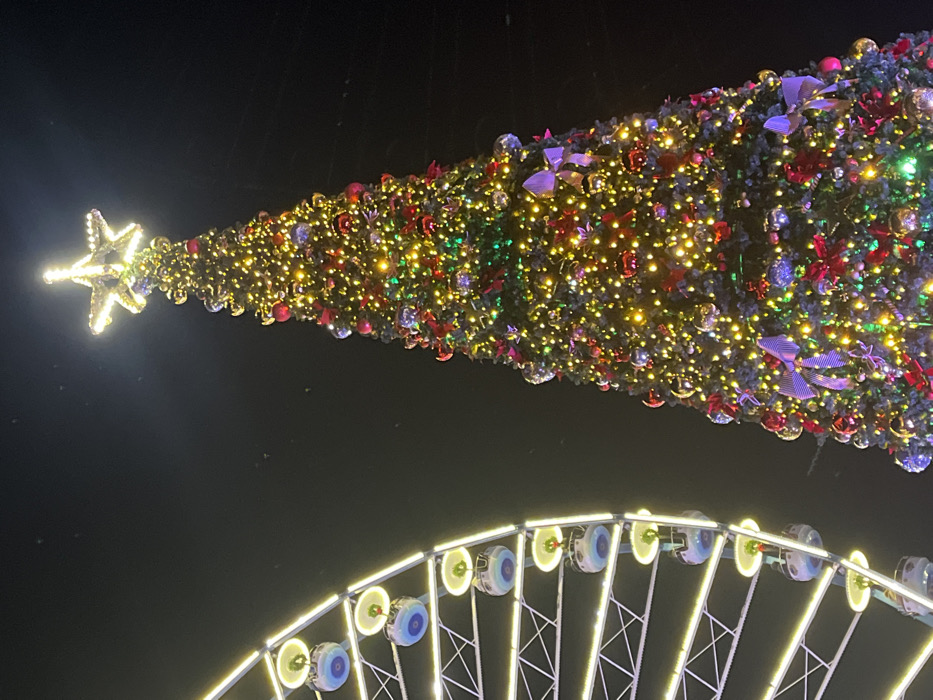 A vibrant Christmas tree with a bright star topper dominates the upper portion of the frame, adorned with colorful ornaments and twinkling lights. The lower part features a Ferris wheel, its structure outlined in white lights, with carriages illuminated. The background is a dark, night sky.