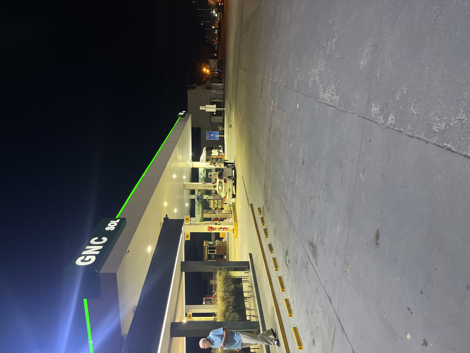 A brightly lit GNC gas station at night. A person stands to the side of the station. A car is at the pump, illuminated by the station's lights. A long stretch of concrete extends from the station, marked by rectangular yellow barriers. Street lights faintly illuminate the distance. The night sky is dark.