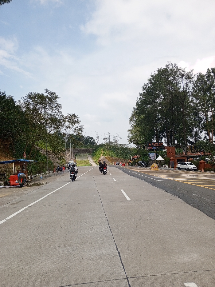 The image depicts a concrete two-lane road in Ciloto, Indonesia, viewed from a low perspective. The sky above is partially overcast with visible blue patches. On the left side of the road, a blue-canopied roadside stall with a red base is present, attended by an individual in a dark shirt bending down. Behind the stall, a sloped embankment is covered with dense green trees and vegetation. A low concrete barrier separates the road from this area. Further down the road on the left, an overpass or bridge structure spans above the roadway. On the road, at least three motorcycles are visible, traveling away from the viewer. One motorcycle is in the left lane, and two are in the right lane, with riders present. The road features white solid and dashed lane markings. To the right of the road, the surface transitions to a darker asphalt patch before reaching a complex entrance structure. This entrance, featuring "BUMI AKAR" signage, is constructed from reddish-brown materials and is flanked by tall, mature evergreen trees. A white car is parked in a paved area beyond this entrance. Small white tent-like structures and other architectural elements are visible around the entrance. The background on both sides of the road is dominated by dense green foliage on elevated terrain.