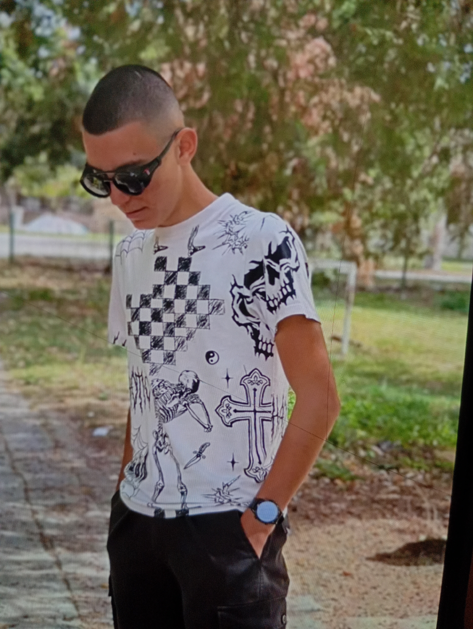 A young man stands outdoors on a paved surface, likely a sidewalk or pathway