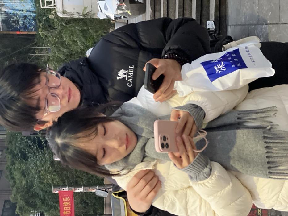 Two individuals, a female and a male, are depicted standing in an outdoor urban setting within Yuzhong District, Chongqing, China. The female, positioned in the foreground, has dark hair and wears a white puffer jacket, a grey ribbed long-sleeve top, and a grey fringed scarf. She is looking down intently at a pink-cased smartphone held in both hands. Her face is visible from the forehead to below the chin. The male, standing behind and to the right of the female, has dark hair and wears glasses. He is dressed in a black puffer jacket featuring a 'CAMEL' logo on the chest. His right arm extends around the female's left shoulder. He holds a black smartphone in his left hand and also carries a white plastic bag with blue Chinese text, reading '深爱' (deep love) and '重庆特色 记念品' (Chongqing specialty souvenir), in the same hand. A dark beaded bracelet is visible on his left wrist. Both individuals appear engrossed in their respective smartphones, with the male's arm indicating a close interaction. The background includes green foliage, building facades, and a red banner to the left displaying Chinese characters '节日快乐!' (Happy Festival!). To the right, a reflective, geometric sculpture is visible adjacent to a set of stairs. The ground surface appears paved.