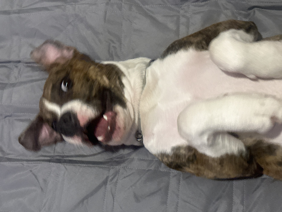 - "A brindle and white dog lies on its back on a gray blanket" by FM-2t2Dl2, licensed under CC BY 4.0