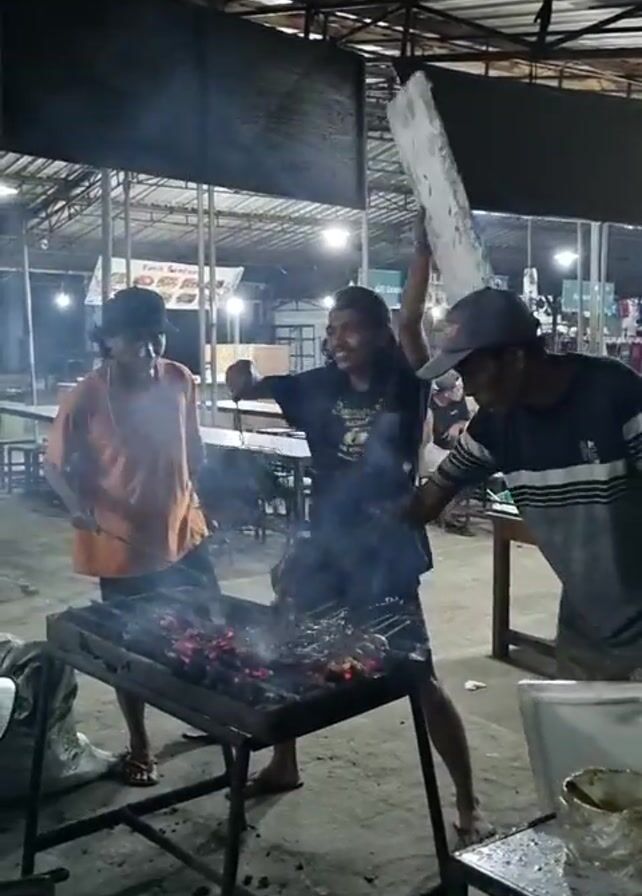 Three men are grilling skewers over a charcoal grill in an open-air restaurant. The man in the center is fanning the coals with a piece of sheet metal, raising it above his head at one point. He wears a dark t-shirt and shorts and is barefoot. The man to the left is wearing an orange t-shirt and sandals, holding a metal skewer. The man on the right wears a striped shirt and a baseball cap. Smoke rises from the grill. Behind the grill are empty tables and chairs, and signs for "GILI SEAFOOD." The restaurant has a metal roof.