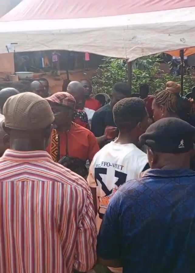 gathering of people outdoors, possibly at an event or ceremony. Many people are standing around under a tent, while others are seated on chairs or benches. The people appear to be dressed in casual or semi-formal attire, with some wearing traditional African clothing. There is also music playing in the background. The setting appears to be a residential area, with buildings and vegetation visible in the background.