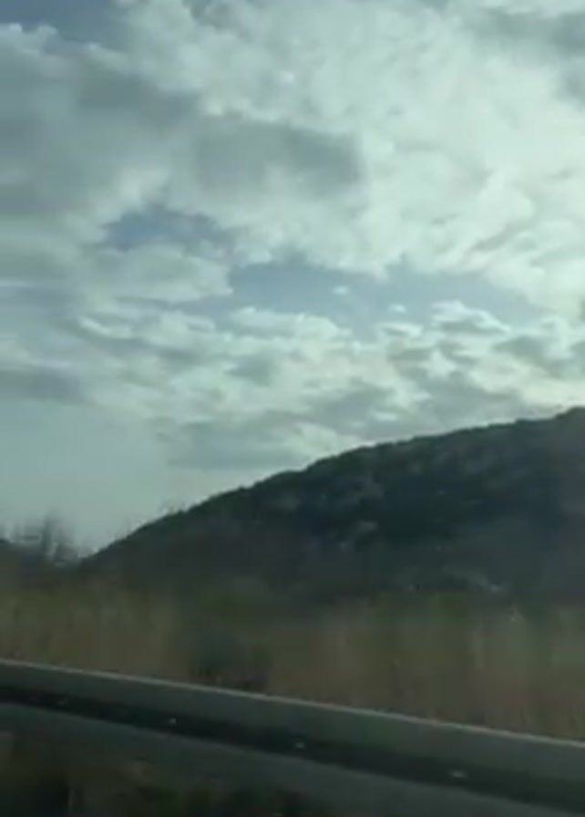 view from inside a moving car driving on a paved road. The sky is visible through the windshield, showing a bright sky with scattered clouds. The landscape visible out the side window features mountains and sparse vegetation. A guardrail is visible along the side of the road, partially obscuring the view. As the car moves, the scene shifts to reveal a road with white dividing lines, a warning sign, and another car in the distance. The roadside shows buildings on an upward slope and more mountains.