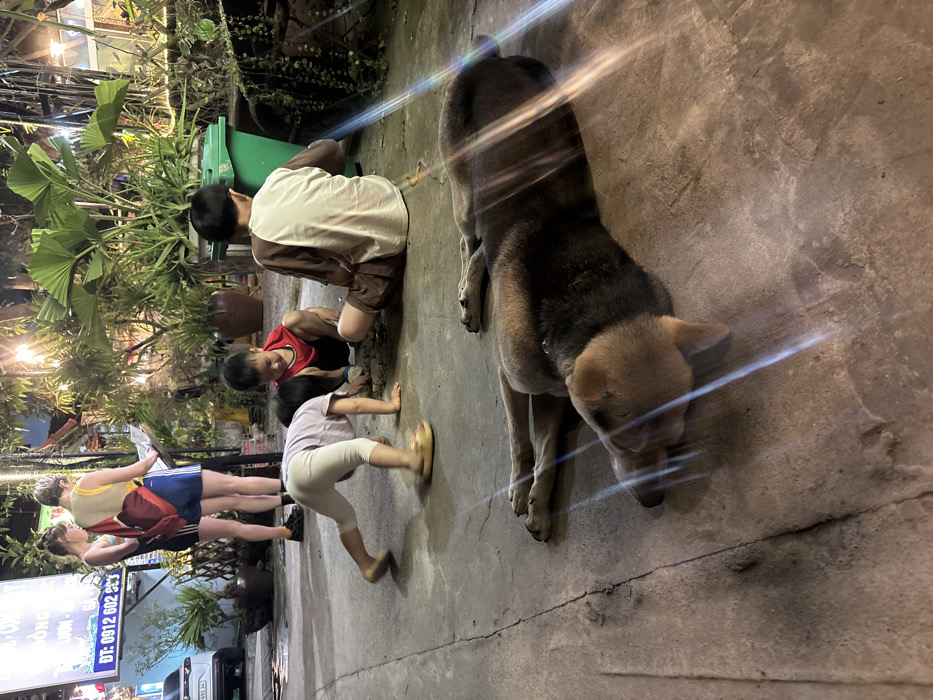 The image depicts a nighttime outdoor scene in Nam Hoa Lư Ward, Vietnam, illuminated by artificial lights. In the foreground, a medium-sized dog with a tan head and dark brown body lies asleep on its left side on a concrete surface. Lens flares are prominent across the dog and ground. In the midground, three children are present. A young child, dressed in light-colored pants and a top, is in a crawling stance wearing yellow sandals, facing right and looking towards the ground. To their right, a second child wearing a red shirt and dark shorts is squatting, looking down at the ground. Further right, a third child wearing a two-toned tan and brown top with dark shorts is seated on the ground, facing away from the camera towards a green plastic trash bin positioned against a background of lush potted plants. In the background, two adult females stand on the left, facing a menu or sign. The woman on the left wears a dark tank top, dark shorts, and a red backpack. The woman on the right wears a light-colored top and dark shorts. A white car is partially visible behind them. The area is decorated with numerous potted plants, foliage, and string lights, creating a warm ambiance. A sign with Vietnamese text and a phone number (0912 602 883) is visible on the far left.
