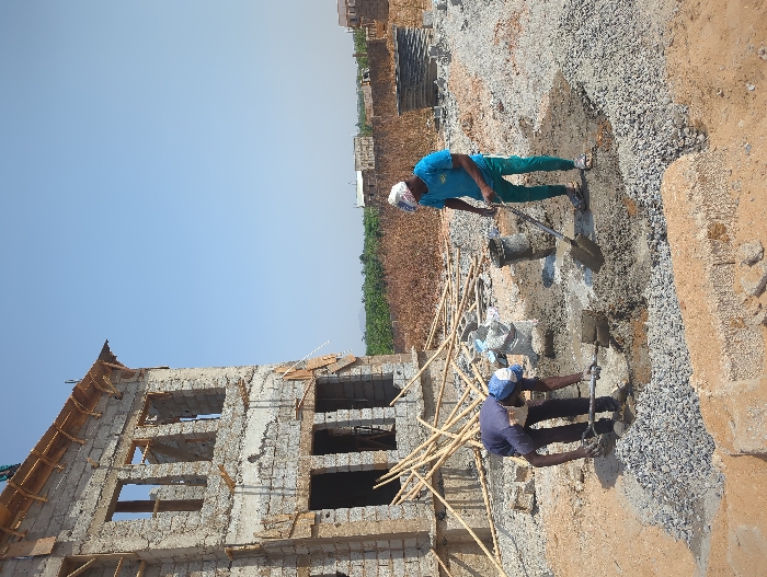 The image depicts an outdoor construction scene in Karsana 2, Nigeria, under a clear blue sky