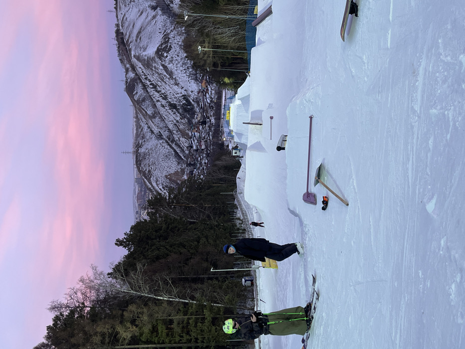 - "The image depicts an outdoor snow-covered ski terrain park at dusk or dawn, characterized by a pink and purple sky over a mountainous landscape with a city in a valley" by FM-EWQei2, licensed under CC BY 4.0