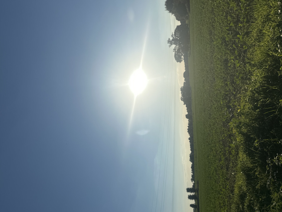 The image displays a wide-angle landscape scene captured on a clear, sunny day in Chantepie, France. The upper two-thirds of the frame is dominated by a bright, azure sky, featuring the intensely luminous sun positioned slightly above and to the right of the center, emitting significant glare and lens flare. A large green field, appearing to be cultivated land, occupies the lower third of the image. In the mid-ground on the left, multiple horizontal power lines traverse the sky, extending towards the right. A distinct horizon line separates the sky from a distant treeline and dense foliage, which extends across the frame, becoming more prominent on the right side. The foreground consists of rougher green vegetation and grasses. No individuals or animals are visible.