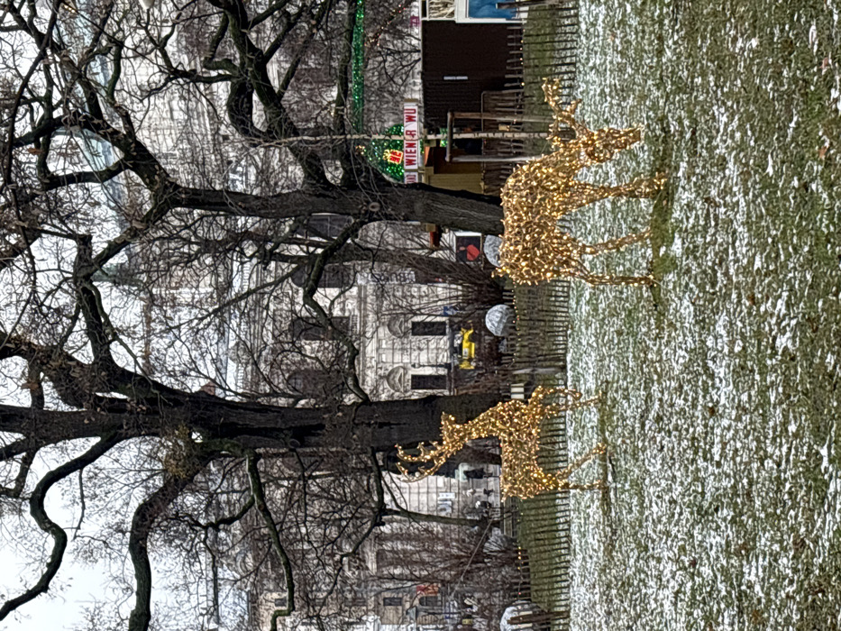 The image captures an outdoor winter scene in Vienna, Austria, featuring festive decorations. In the foreground, two large, illuminated reindeer figures, constructed from warm-toned string lights, stand on a patch of green grass lightly covered with patchy snow. One reindeer is depicted standing upright with antlers, facing left, while the other is bent forward, appearing to graze, with antlers, facing right. A low, rudimentary wooden fence, composed of vertical stakes, separates this illuminated display. In the midground, several large, bare deciduous trees with dark, gnarled branches obscure parts of the background. Through the trees, elements of a temporary market stall structure are visible to the right, featuring brown walls and a green-colored roof section with a sign partially displaying "WIENER WU" (likely "Wiener Wurst"). Green festive lights or garlands are strung above this stall. Further back and to the left, indistinct figures of pedestrians are present, along with a yellow vehicle. The prominent background is dominated by a grand, multi-story neoclassical building, consistent with the Austrian Parliament Building. This structure exhibits intricate light-colored stone facades, numerous arched windows, columns, and a visible dome or tower element against an overcast, bright sky. No direct interaction between people or animals is observable within the frame.