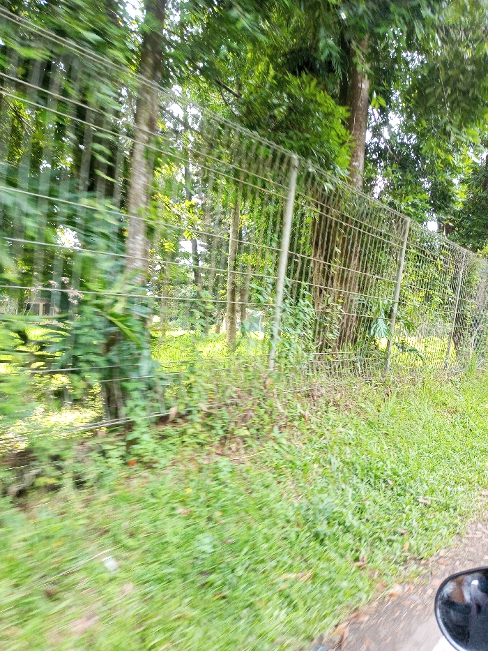 This image captures a view from a moving vehicle in Namthoung, Laos, looking towards a fenced, green area. In the bottom right corner, a portion of a black, reflective vehicle side-view mirror is visible. The immediate foreground consists of blurred green grass and sparse ground vegetation. A weathered metal mesh fence, constructed with vertical posts and interwoven horizontal wires, runs across the midground, extending from the left to the right side of the frame and angling slightly away. Green foliage and weeds are visible growing against and through the lower sections of the fence. Beyond the fence, a dense arrangement of tall trees with lush green canopies dominates the background, with sunlight filtering through the leaves. An open, grassy clearing is discernible through the fence and between the tree trunks. No individuals, animals, or specific man-made structures are present within the fenced area.