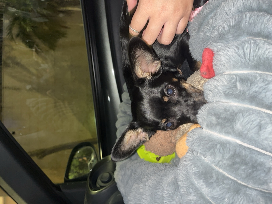 - "A small, black dog with tan markings on its face and prominent ears is positioned within a light grey, ribbed pet bed or blanket inside a vehicle at night" by FM-AjOHL2, licensed under CC BY 4.0