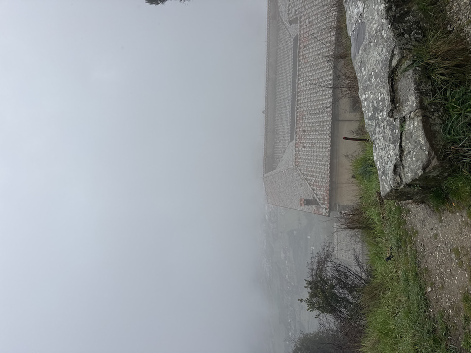 The image presents an elevated view in Cortona, Italy, under extremely foggy conditions. The upper two-thirds of the frame are obscured by dense, uniform grey fog, limiting visibility to the immediate mid-ground and foreground. A traditional Italian building, constructed with light-colored walls and multiple sections of terracotta-tiled roofs, occupies the mid-ground, extending from the center-right towards the left. One red-brick chimney is visible protruding from a roof section. Through the fog below the building, faint outlines of structures and terrain can be discerned, indicating a valley floor with scattered buildings, possibly a small town or hamlet. The foreground features a large, irregular grey stone, extensively covered with green moss and white lichen, positioned in the lower right. Adjacent to this stone, a dirt path is visible, bordered by green grass and various shrubs, some with sparse, leafless branches and others with dark green foliage. No individuals are present, and no actions or interactions are depicted.