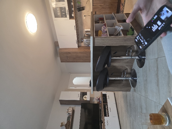 The image depicts an interior residential space, specifically an open-plan living room and kitchen, located in Varna, Bulgaria. The floor is tiled with light-toned rectangular tiles. In the foreground, a person's right hand holds a black smartphone displaying a screen interface, likely a media player, in the bottom right corner. The person's leg, clad in light grey fabric, is partially visible. To the left foreground, a clear glass containing an amber liquid with ice rests on a white coaster on a light-colored surface, presumably a coffee table. The midground features a prominent kitchen island with a light wooden base and a lighter countertop. Two black, height-adjustable bar stools with chrome bases are positioned at the island. One side of the island incorporates open shelving holding various items, including folded textiles and what appear to be small containers. Beyond the island, the kitchen area is visible, equipped with white upper cabinets, some featuring glass fronts, and wooden lower cabinets. A sink area with a faucet is present. Items are seen hanging on the wall above the counter. A dark patterned rug is on the floor near the kitchen counter. A tall wooden cabinet stands to the left of the kitchen fixtures. In the background, a flat-screen television is mounted on a white and wooden media console in the living room area. Above the television, a wall-mounted wooden shelf displays decorative objects. A partially open white door with a frosted glass panel leads to an adjacent room or hallway. The ceiling is white and features a single large, circular LED light fixture providing illumination. No other individuals are present in the observable scene.