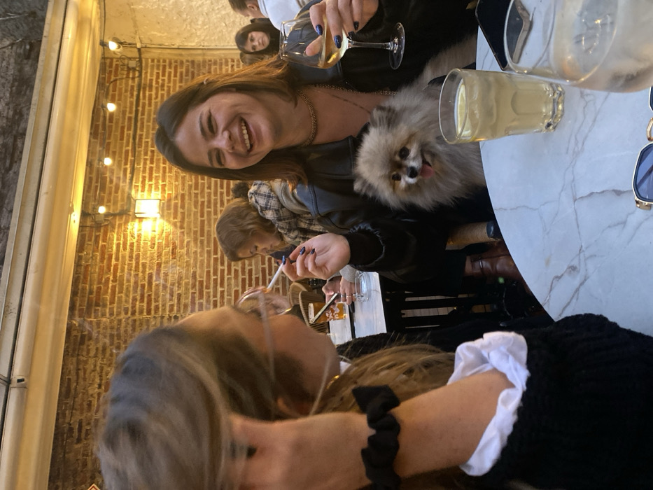 The image depicts an evening scene at an outdoor or semi-enclosed patio of a bar or restaurant in Lille, France. In the mid-ground, a woman with shoulder-length dark hair, wearing a black leather jacket and a gold choker, smiles broadly while holding a glass of white wine in her left hand. A small, fluffy tan dog, possibly a Pomeranian, sits on her lap, looking forward with its tongue slightly extended. Her right hand is raised, showing dark blue nail polish. To her left, partially visible in the foreground, is a person with light-colored hair, wearing glasses, a black scrunchie on their left wrist, and a dark sweater over a white shirt. Their face is in profile, turned towards the smiling woman. In the background, another woman with brown hair, wearing a plaid top, is seated at a separate table, holding a lit cigarette between fingers with dark blue nail polish. An ashtray and a glass of beer with an orange label are on her table. Further in the background, additional blurry patrons are visible. The tables are white with a marble pattern. On the table in front of the main subjects, there is a tall glass containing a light-colored beverage with a lemon slice, a smartphone, and a pair of folded sunglasses with blue lenses. The background features an illuminated red brick wall with string lights and a wall-mounted light fixture. A light-colored awning or retractable roof structure is visible at the top of the frame.