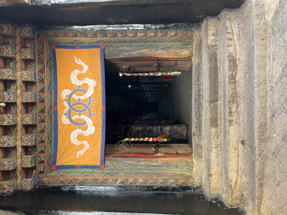 The image displays the entrance to a building in Chengguan District, China. Three weathered, rough-hewn stone steps lead up to a decorated wooden doorway. The doorway is framed by an architrave featuring intricate geometric and floral patterns painted in red, green, blue, and yellow, with outer sections painted black. A yellow fabric banner with a blue border hangs above the entrance, displaying a central white emblem resembling two intertwined endless knots flanked by stylized white cloud patterns. A coiled fluorescent light bulb is visible above the banner on the left. The two wooden doors are partially open, revealing a dimly lit interior. Each door is painted with vertical sections of color and features ornate metal hardware. A braided multi-colored hanging, composed of red, yellow, green, blue, and white strands, is suspended from each door's interior side. A small fan is mounted on the left side of the doorway. Beyond the threshold, a long, dark hall extends into the background. Rows of thick, dark, cylindrical pillars are visible, diminishing in size with distance. Several small, bright light sources are discernible further down the hall, providing minimal illumination. The floor inside appears to be a dark, flat surface. The ground immediately preceding the stone steps is composed of rough stone pavers. No persons are present in the scene.